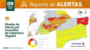 La Corporación Autónoma Regional de la Orinoquia, informa que, de acuerdo con el monitoreo por parte del IDEAM, se ha registrado un aumento en las alertas por incendios de cobertura vegetal en la jurisdicción. Actualmente, el 29% del territorio se encuentra bajo amenaza, destacando una situación de Alerta Roja para los municipios de Yopal, San Luis de Palenque y Hato Corozal en Casanare; Puerto Carreño en Vichada; y Guayabetal en Cundinamarca.