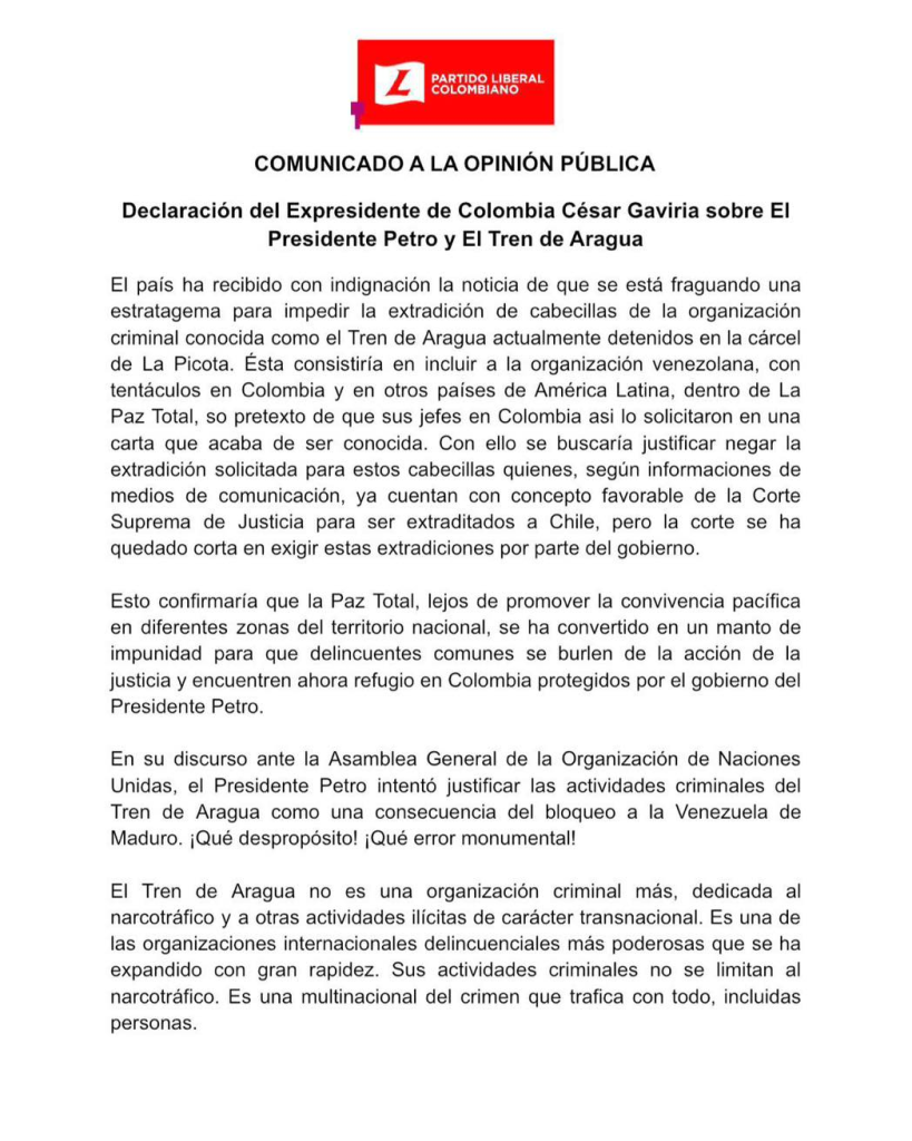 El expresidente César Gaviria rechazó la posibilidad de que el presidente Gustavo Petro inicie diálogos de Paz con cabecillas del Tren de Aragua, asegura que esto impediría la extradición de los miembros de la organización.